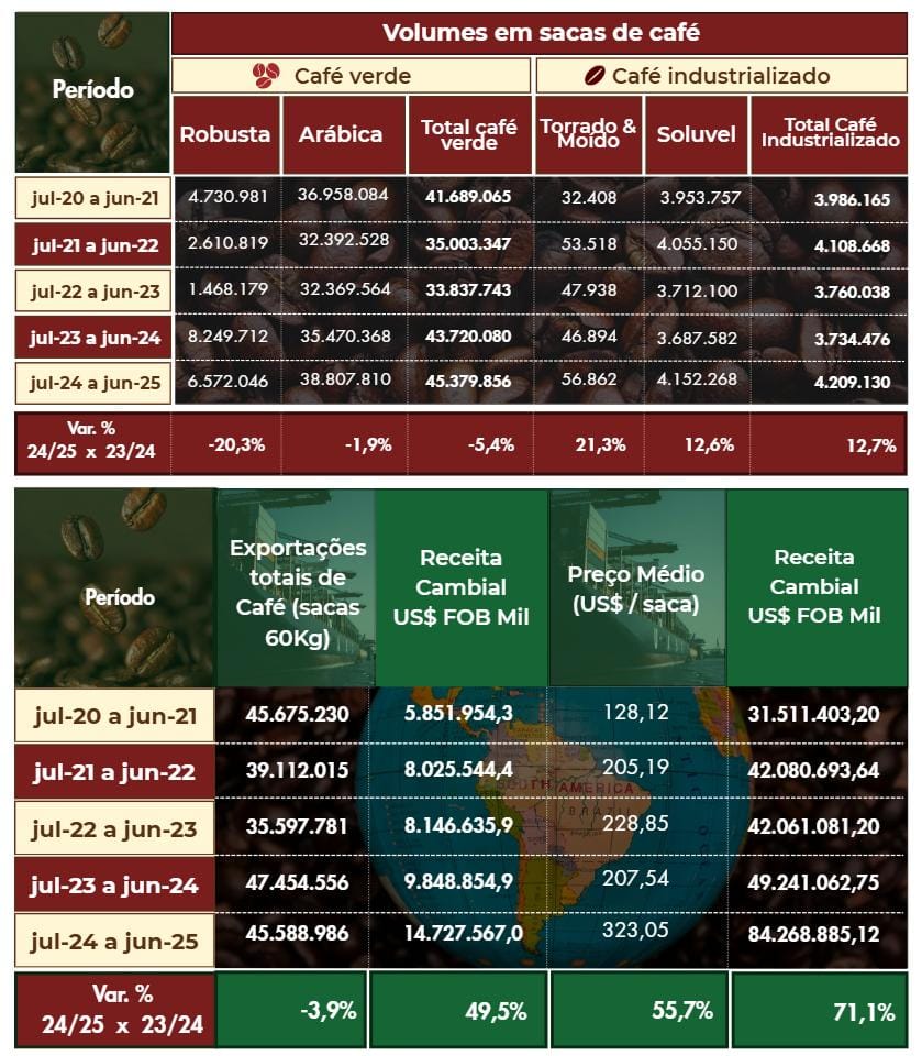 Apesar da redução de 3,9% no volume exportado, com 45,589 milhões de sacas de 60 kg embarcadas para 115 países, o desempenho foi o terceiro maior da história em termos de quantidade. A valorização da commodity no mercado internacional, impulsionada por eventos climáticos extremos que afetaram a produção em países como Vietnã, Colômbia e Indonésia, foi determinante para o crescimento da receita.