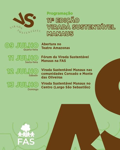 No dia 11, a sede da Fundação Amazônia Sustentável (FAS) recebe o Fórum da Virada Sustentável Manaus, reunindo ativistas, especialistas e representantes da sociedade civil. O objetivo é construir coletivamente uma carta da “Manaus dos nossos sonhos”, como contribuição para a COP30, que ocorrerá em novembro, em Belém (PA).